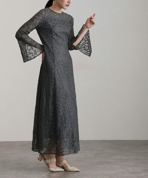 総レースベルスリーブロングドレス