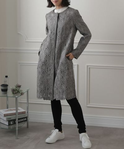 シンプルなシルエットながら存在感のあるレースレザー使用のコート。