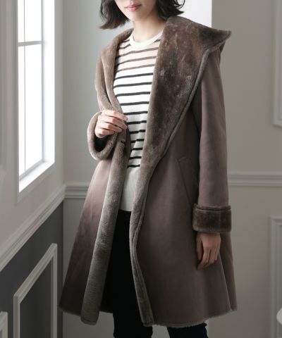 フード付きのビッグカラーと裏起毛のムートンがアクセントになったガウンコート。