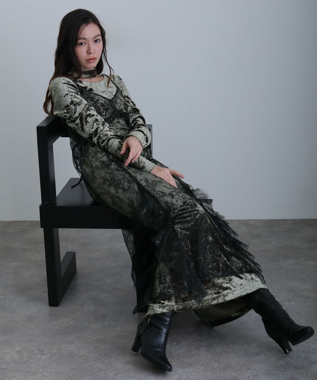 異素材を重ねた表情豊かなジャガード×楊柳シフォンのミックスドレス。