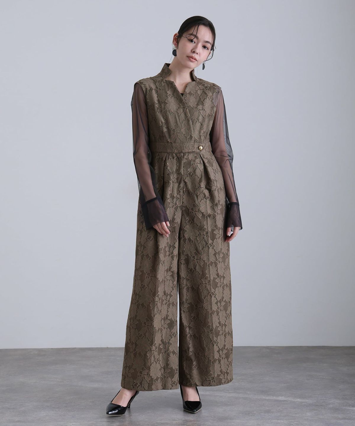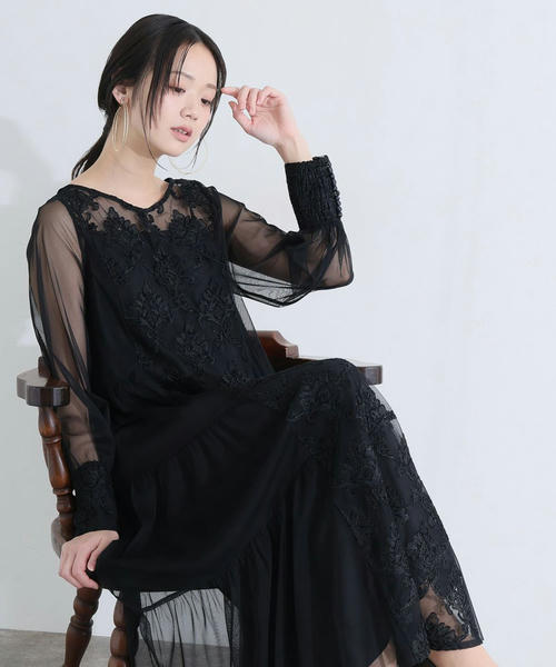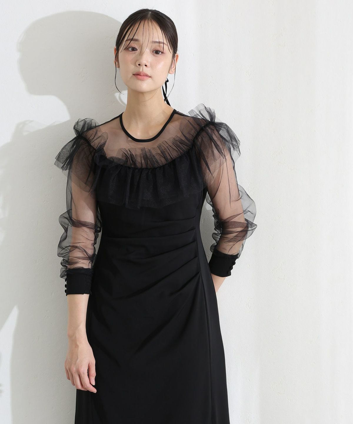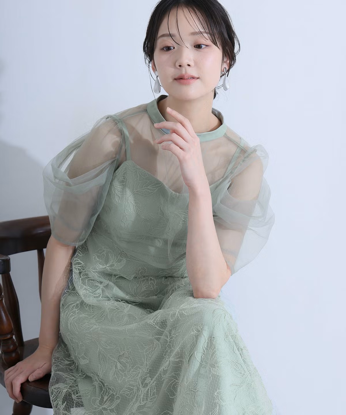 デコルテから袖にかけてのシアーな楊柳シフォンが、程よい抜け感と上品さをプラス。