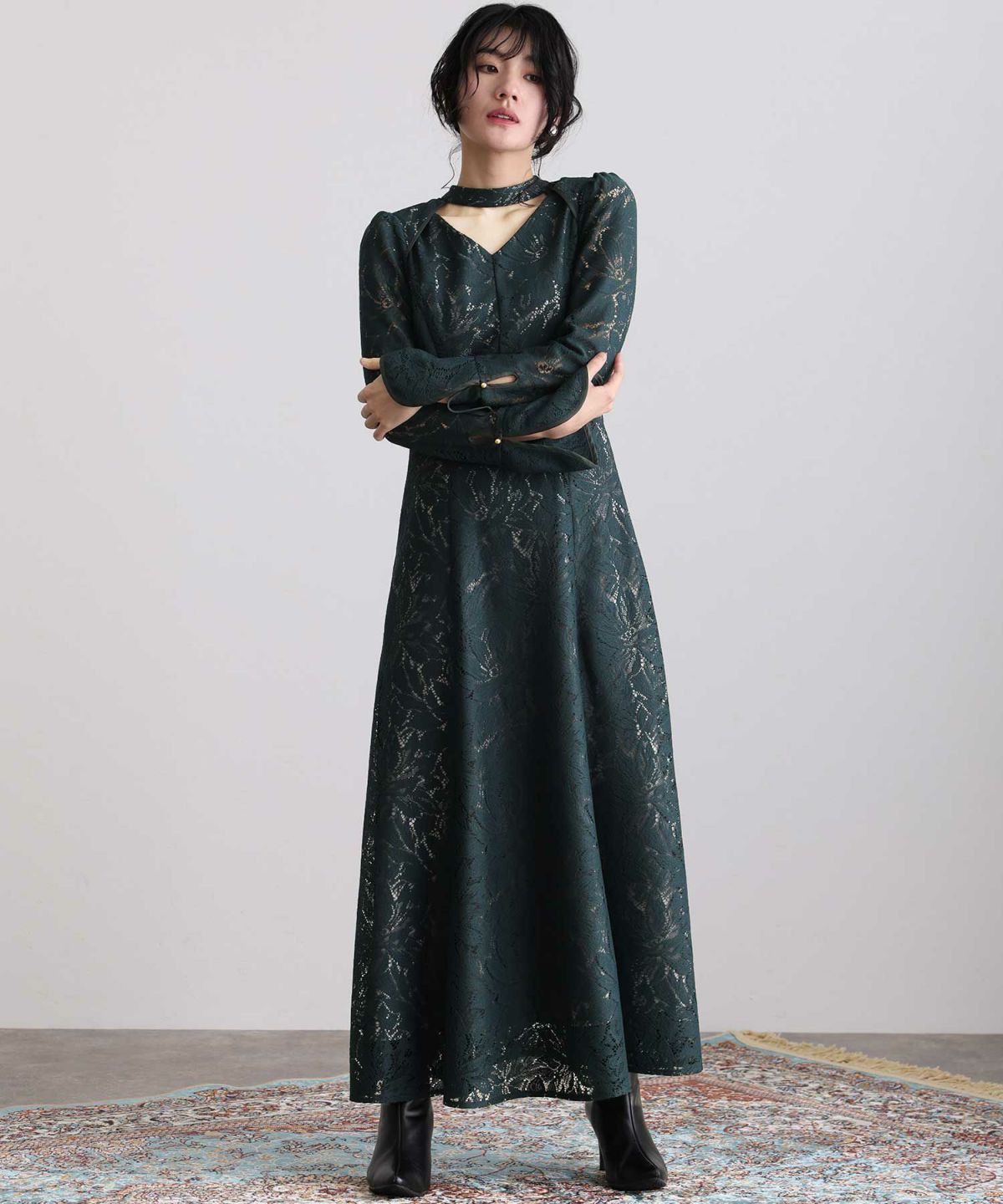 クラシカルなスタンドカラーながらも、スタイリッシュに魅せてくれるデコルテのカッティングデザインがこだわりのポイント。
