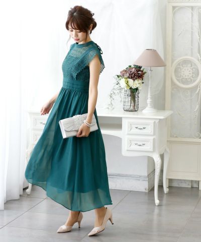 デコルテの透け感が美しいクロシェレースを使用。