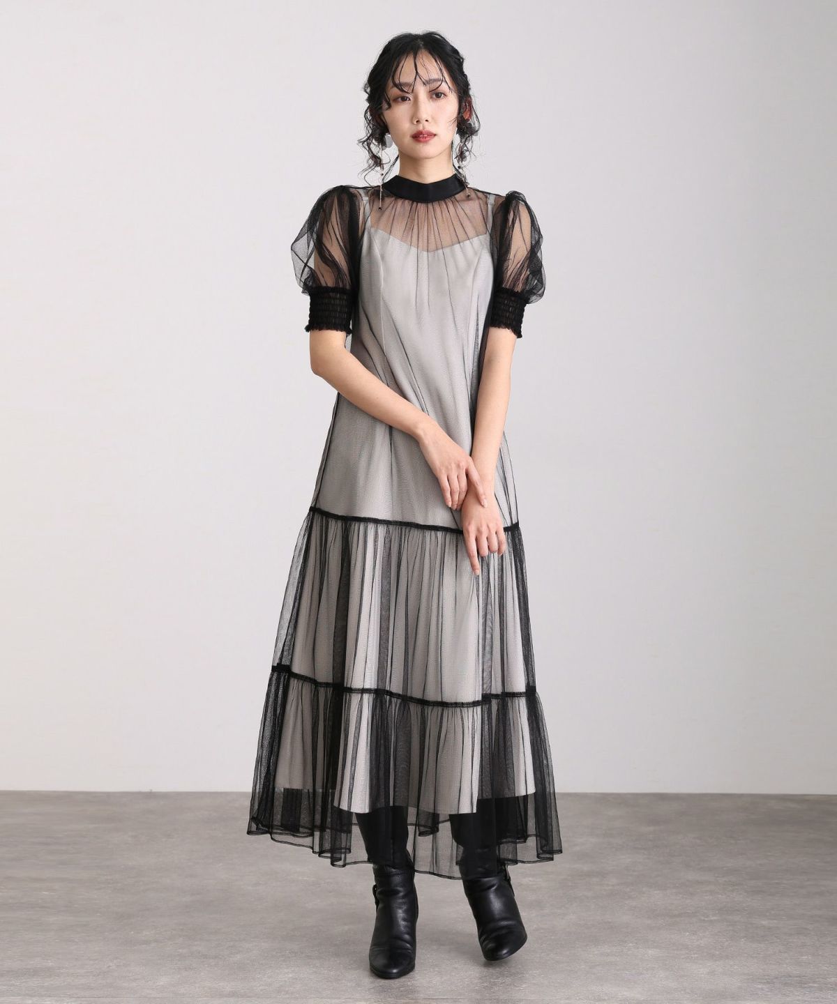 ロングチュールワンピースの上品な重ね着がエレガントで洗練された印象を与えるセットドレス。
