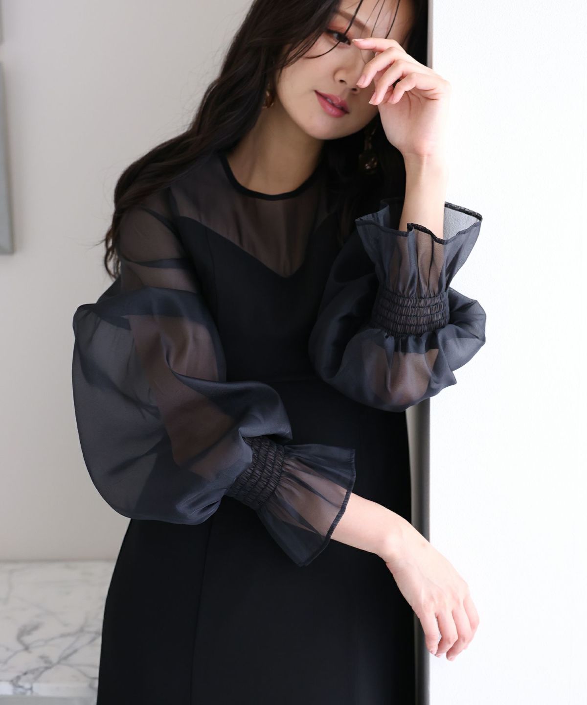シアー感のある袖と裾広がりのスカートが女性らしさを引き立てます。