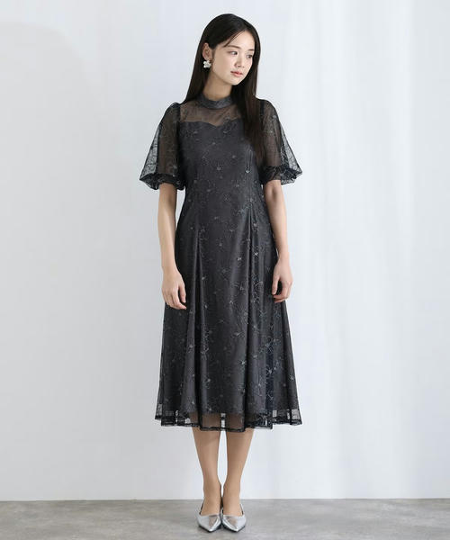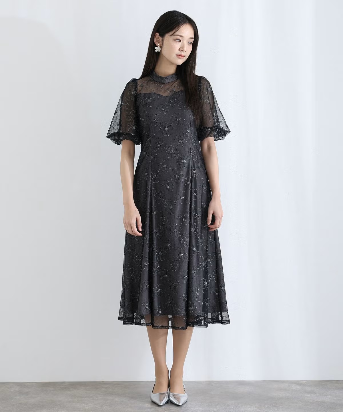 胸元はシアー切り替えを採用し、デコルテラインを美しく演出しながら華やかすぎない抜け感をプラス。