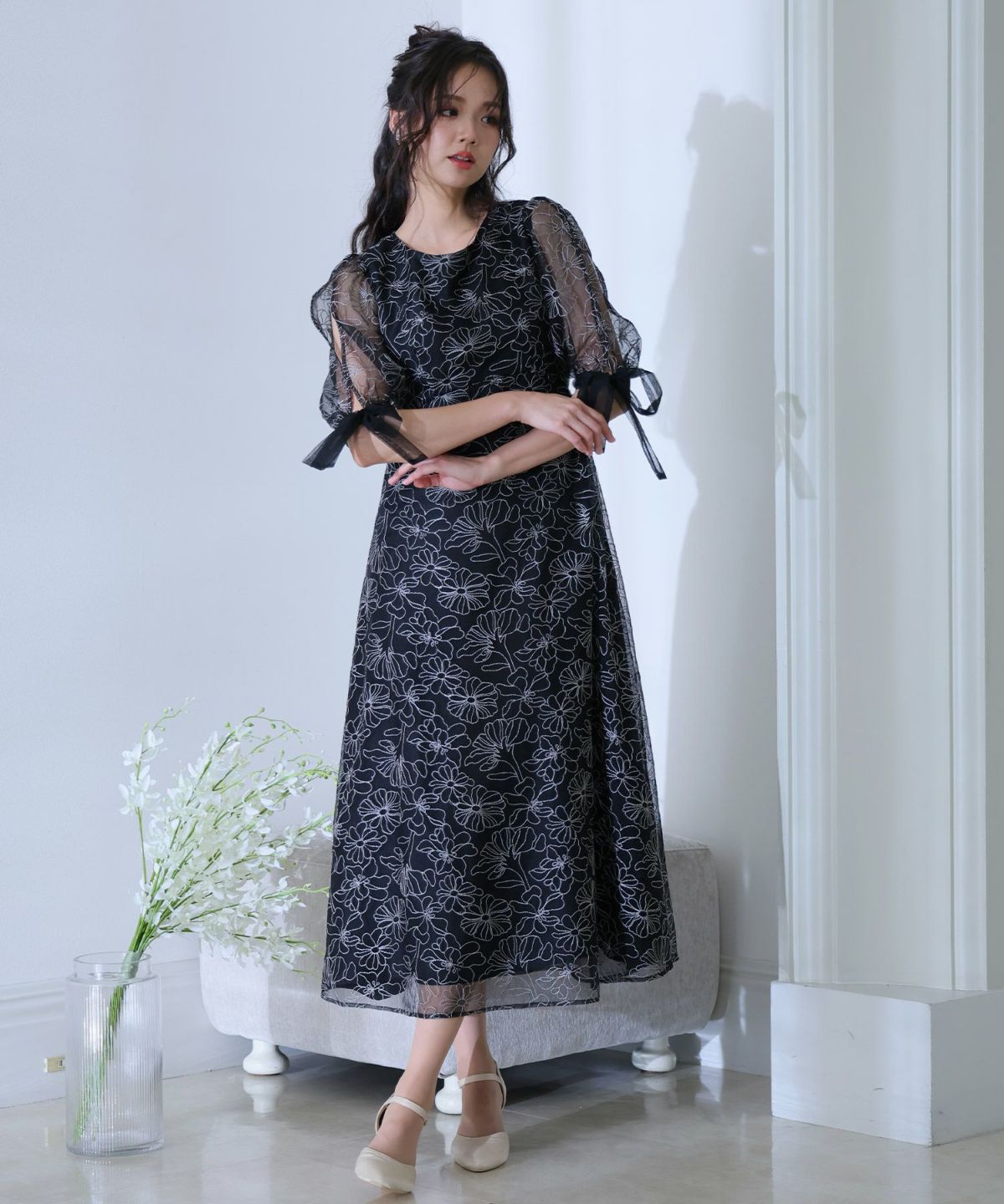 繊細なフラワー総レースが全体を包み込み、華やかな雰囲気を演出。