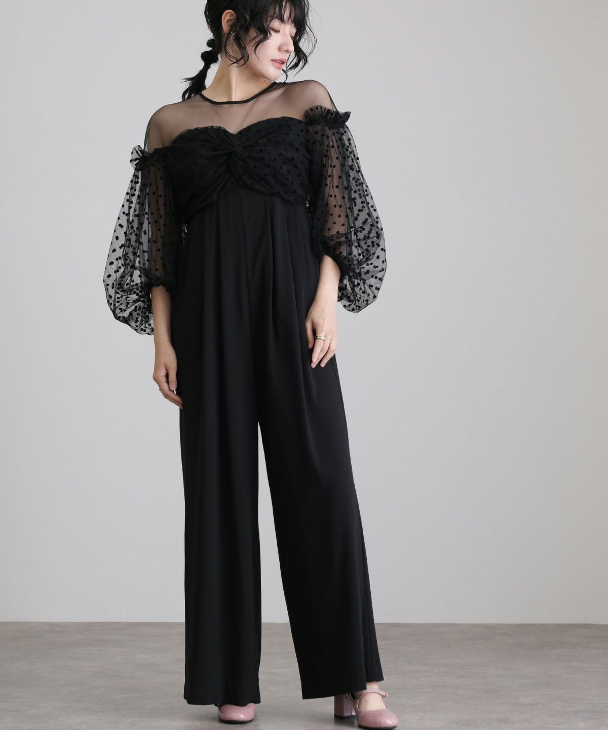独特なシフォン素材とフロッキードットのデザインが特徴のエレガントなパンツドレス。