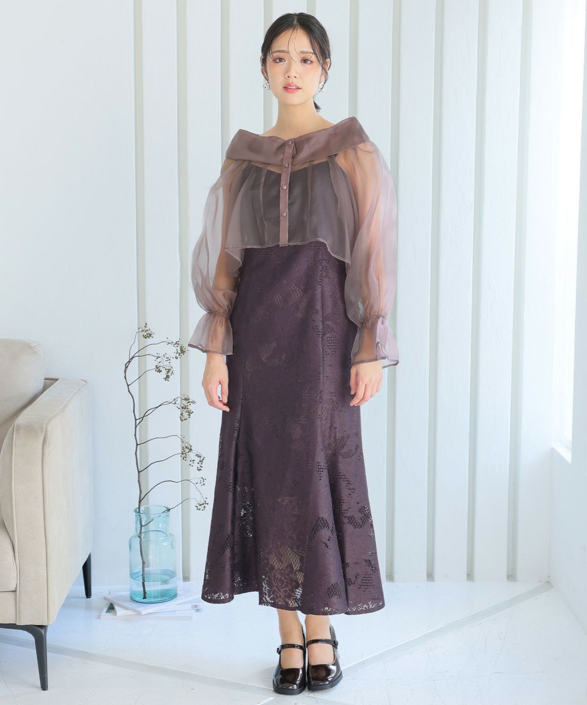 シアーなブラウスと大人っぽいレースキャミワンピのセットドレス。ふんわりと動きのあるブラウスでフェミニンな印象に。大人っぽいレースワンピースで甘くなりすぎず、オトナ女子にもおすすめです。ブラウスは前後を逆にして着用したり、ボタンを開けてボレロの様に着用しても◎