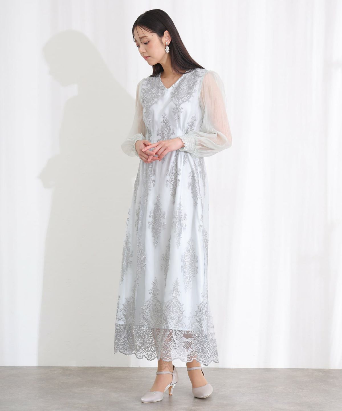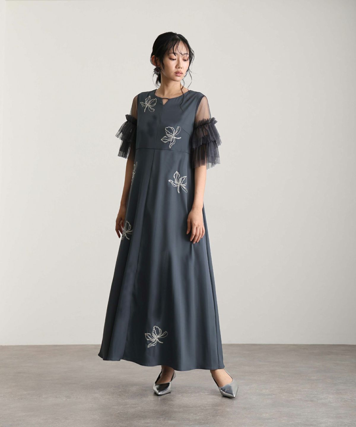 繊細なチュールスリーブと立体的な花柄刺繍が映えるIラインドレス