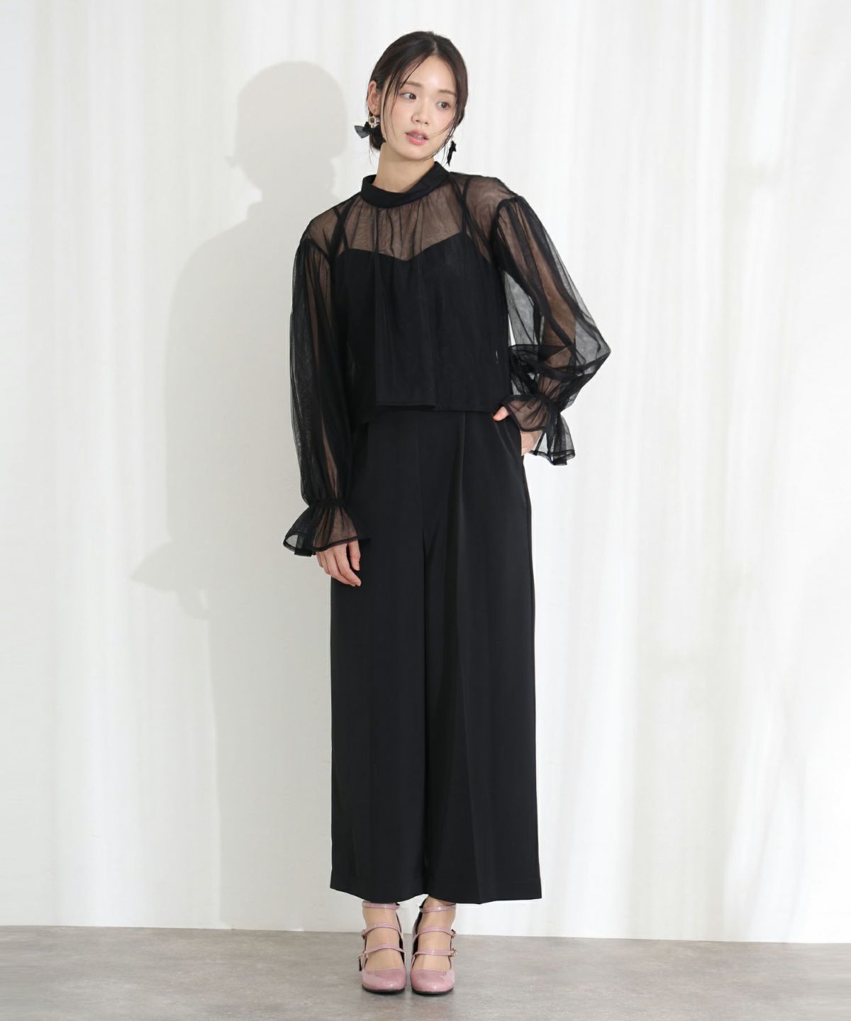 シアー素材の長袖が抜け感を与え、エレガントながらも重くなりすぎないデザイン。