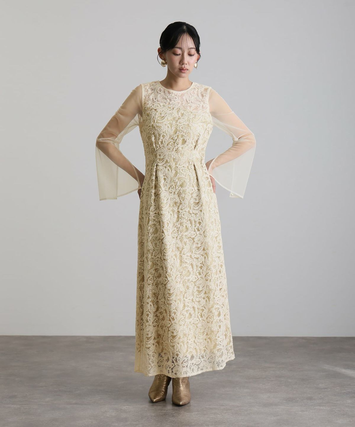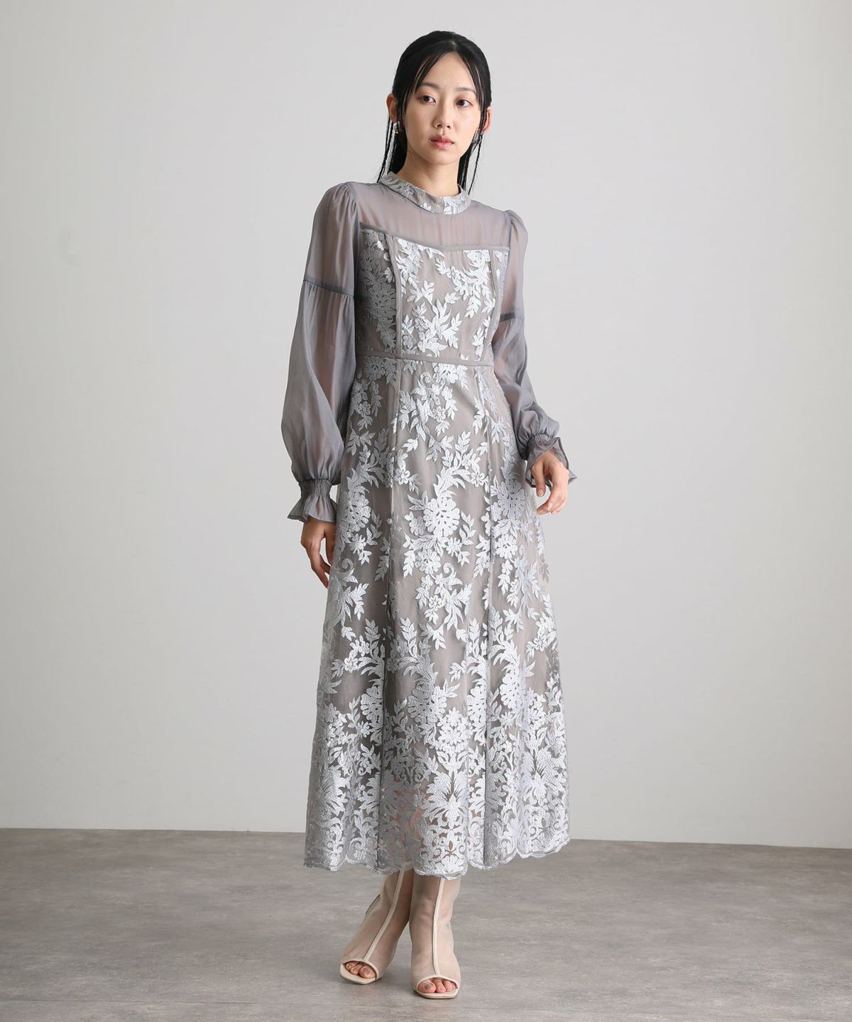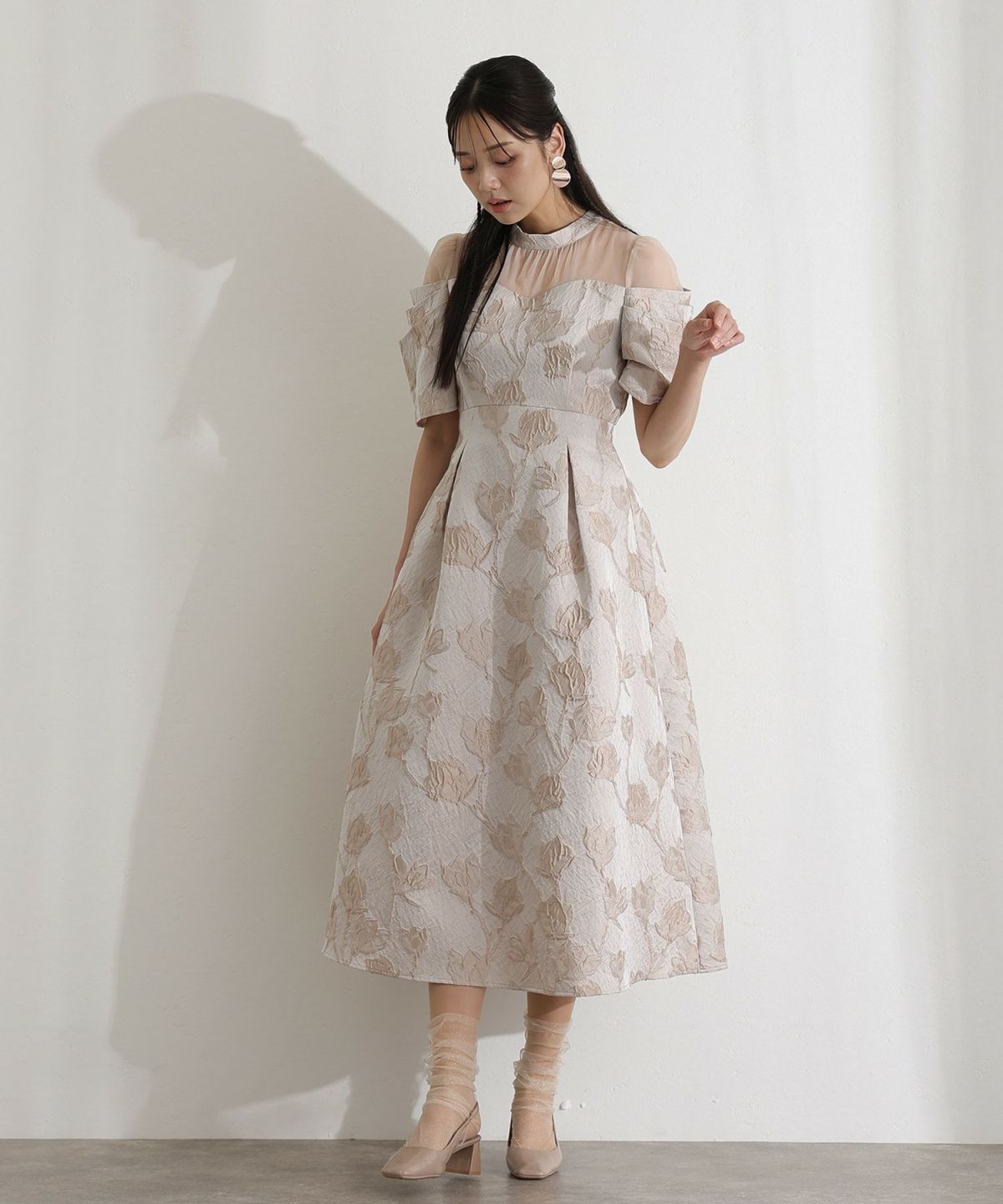 立体感あるフラワージャガードと、透け感のあるシアーを組み合わせた上品なドレス。