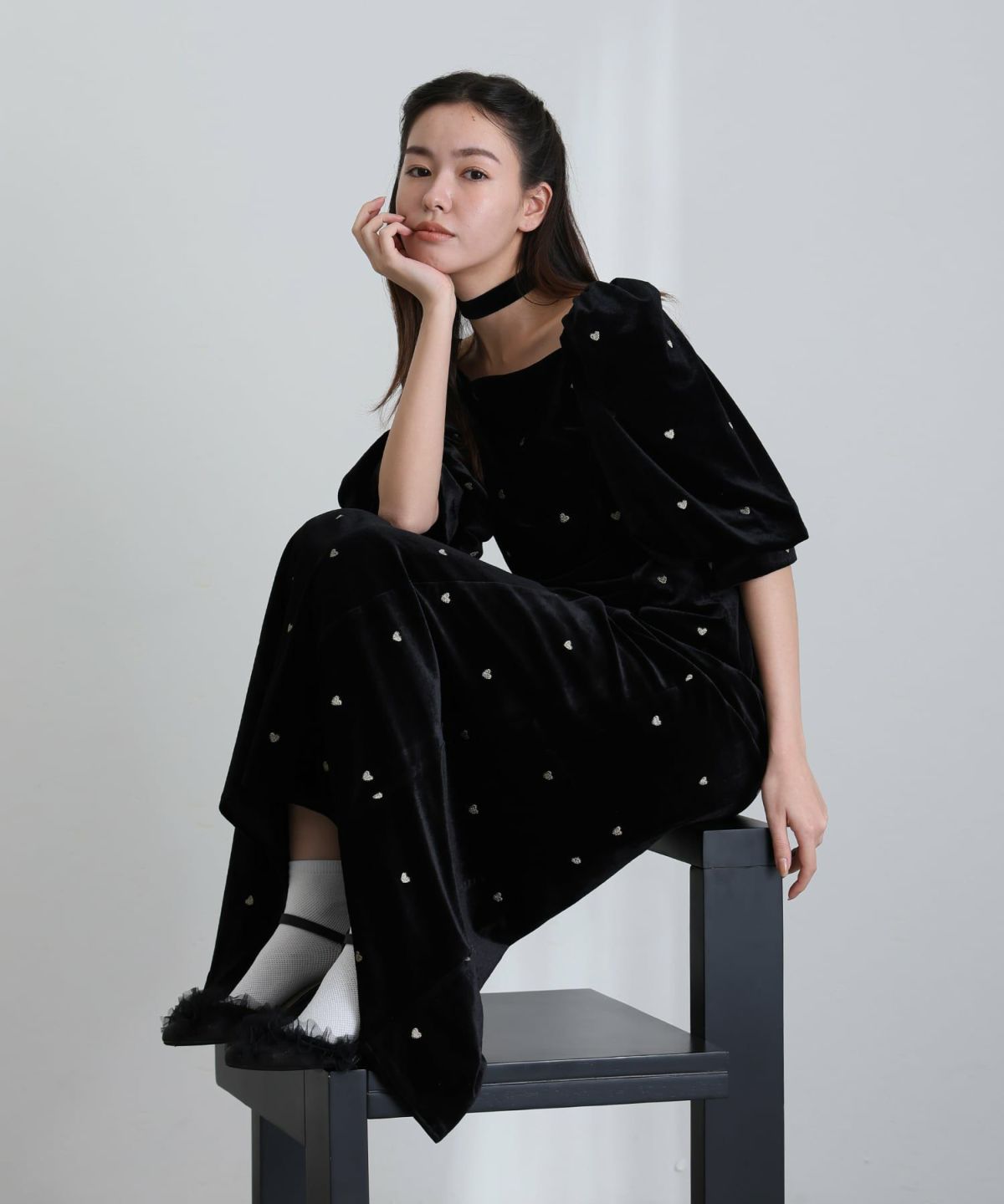 ドレス全体に散りばめられたハートがフェミニンな雰囲気に。