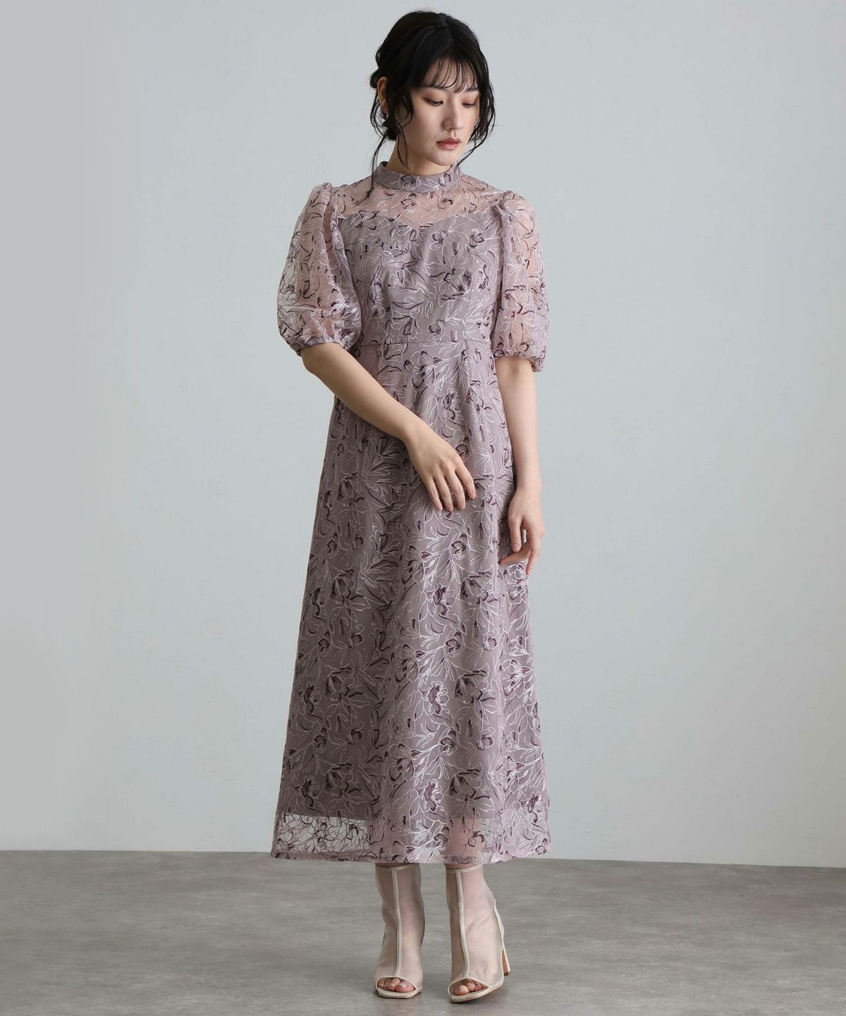 軽やかなチュール素材と花柄モチーフが映える、大人上品なパーティードレス。