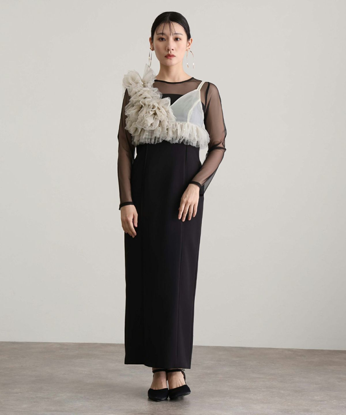 透け感のあるチュールにフリルを重ね、二の腕をカバーしながら女性らしい印象に。