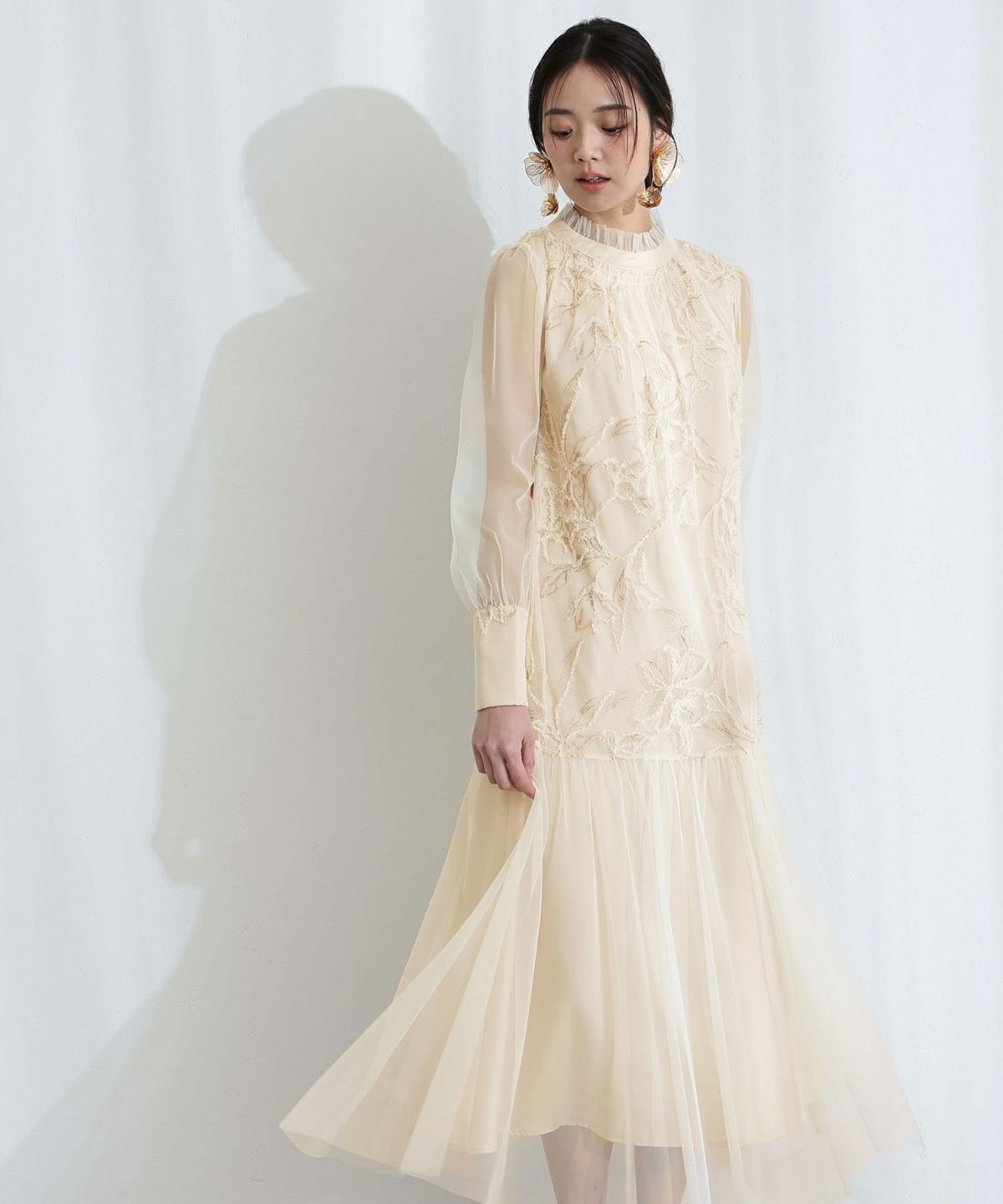 繊細なフェザー糸とラメ糸を織り交ぜたフラワー刺繍が華やかに輝く一着。