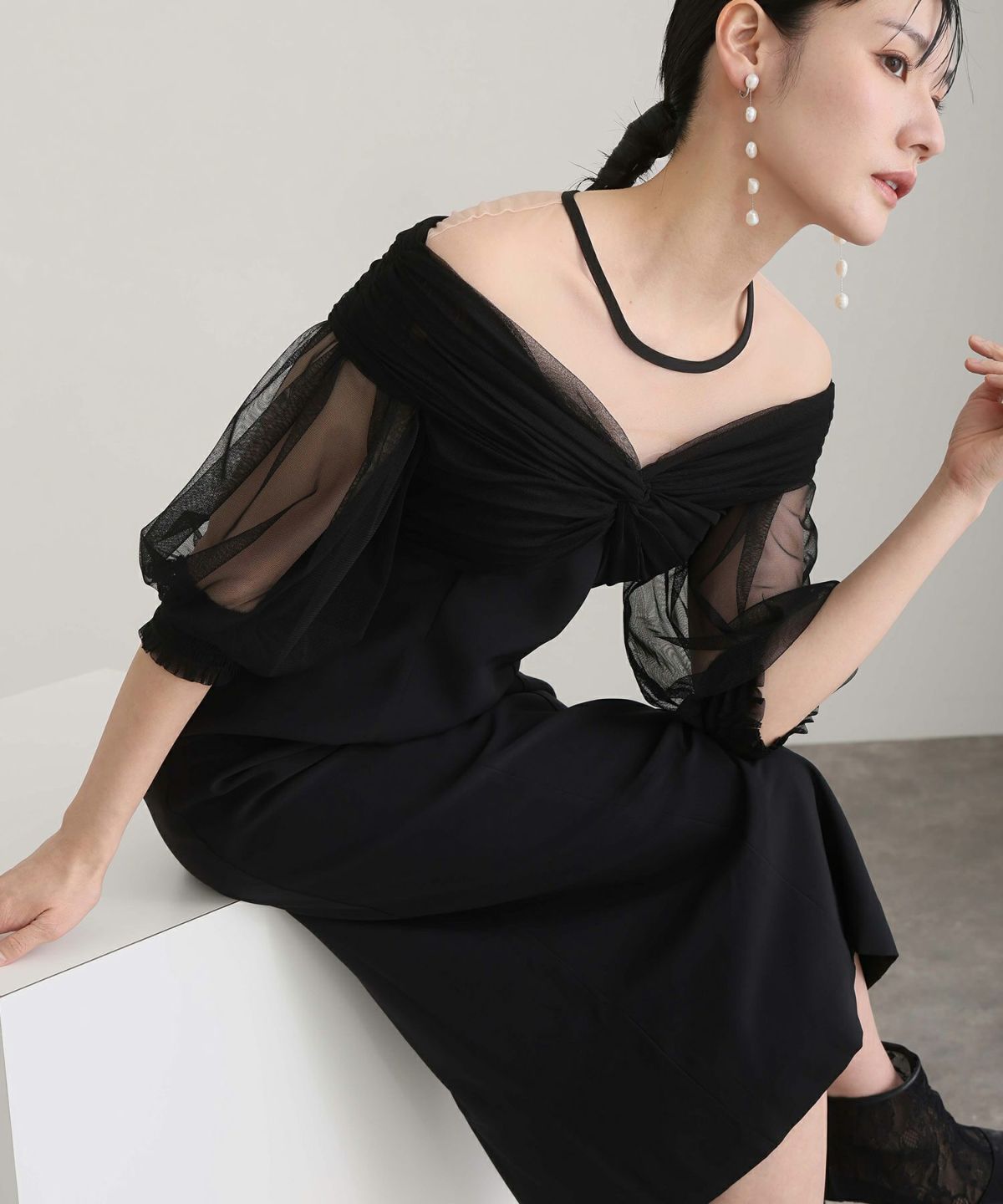 オフショルダー部分には肌色のチュールを仕様しているので、ズレを気にせず着用可能。